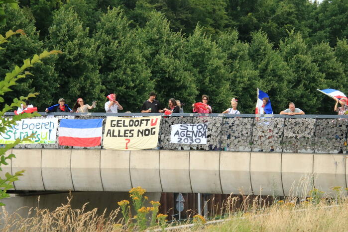 Op een viaduct zijn meerdere spandoeken opgehangen en staan mensen met vlaggen. Via de actie willen ze steunbetuiging aan de protesterende boeren.
