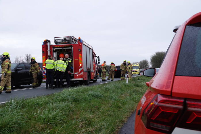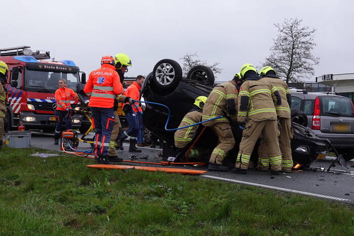 Tenminste vijf auto's raakten elkaar. Één van de voertuigen kwam op de kop tot stilstand. De brandweer moest er aan te pas komen om een inzittende te bevrijden. Hoeveel gewonden er zijn bij dit ongeval is niet precies duidelijk. Zeker een vrouw die bekneld raakte is naar het ziekenhuis gebracht.