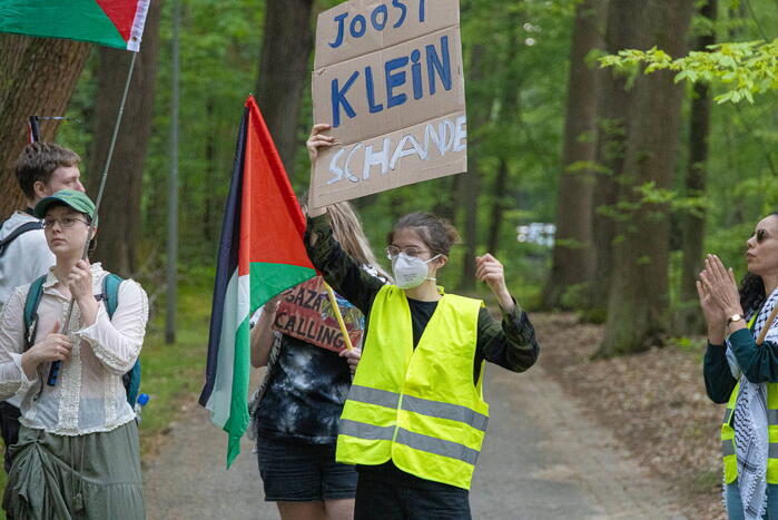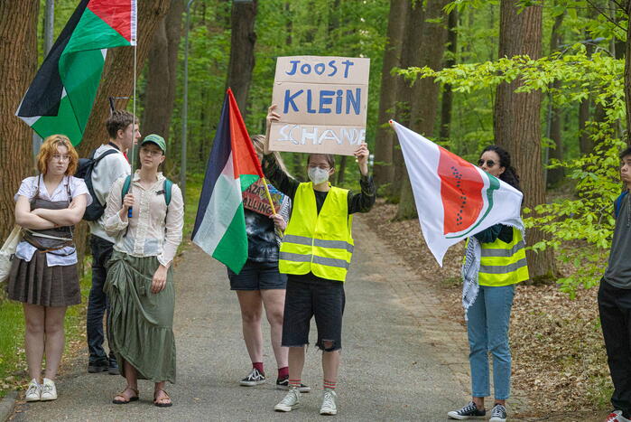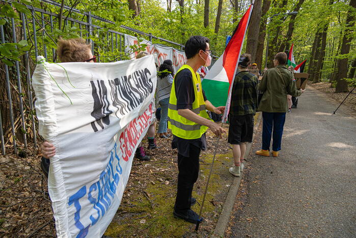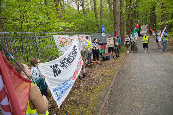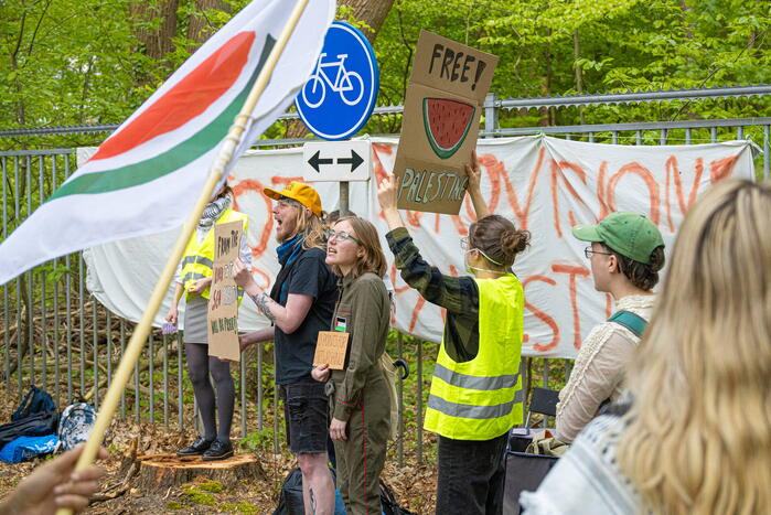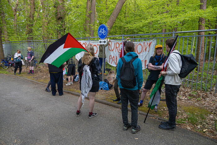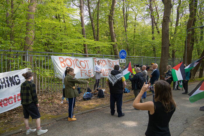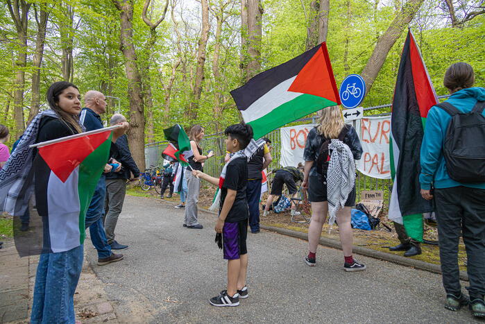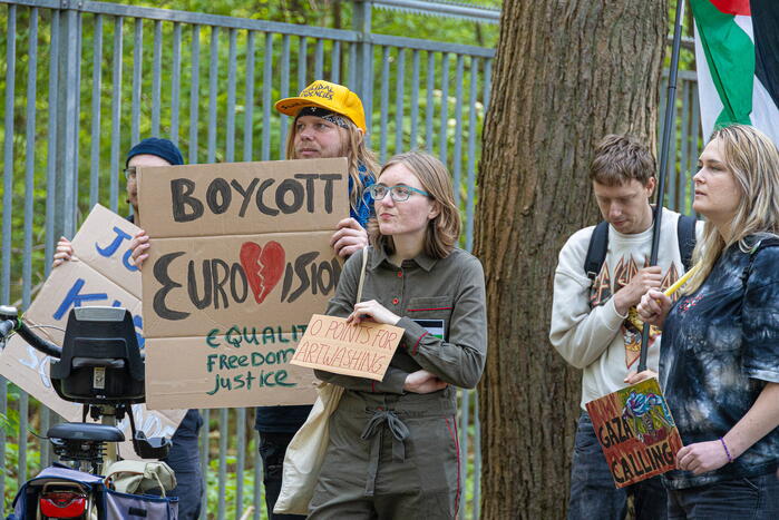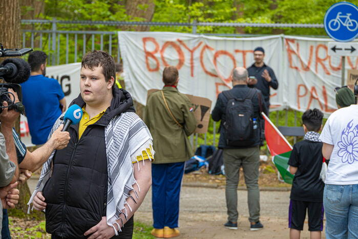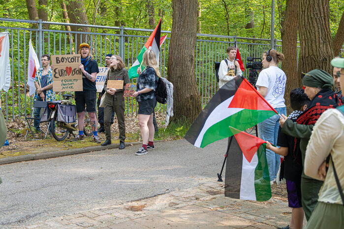 HILVERSUM - Donderdagmiddag 2 mei rond 17.30 uur hebben betogers van Hilversum4Palestine op het Media Park bij het AVROTROS-gebouw aan de Witte Kruislaan in 112 Hilversum gedemonstreerd tegen het besluit van het Eurovisie Songfestival.