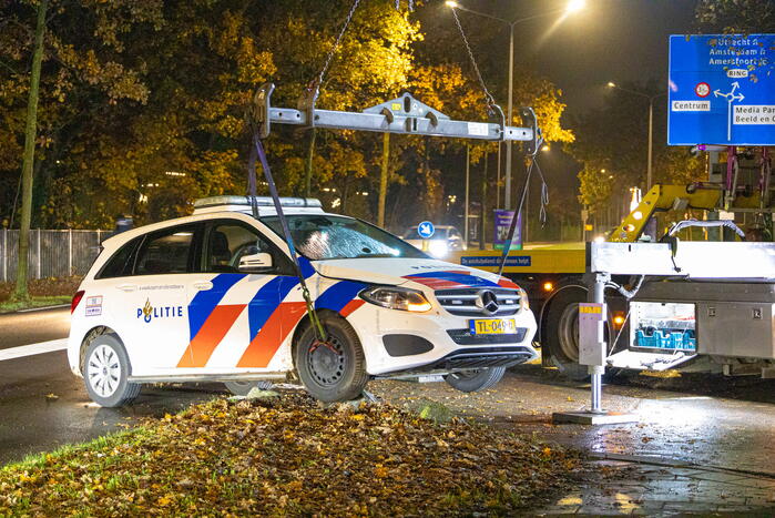 HILVERSUM - Maandagavond is op de Mies Bouwman-boulevard op het Hilversumse Mediapark een politieauto op een betonblok gereden.