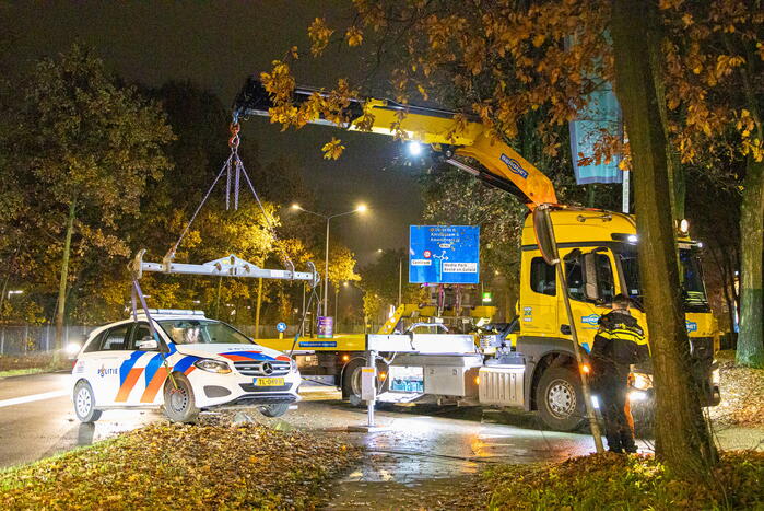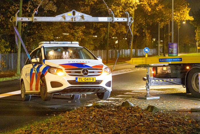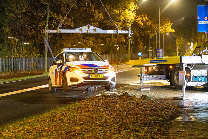 De auto is door een berger opgetild en van het blok afgehaald. Het betreft gewoon een stuurfout. De politie had geen spoedmelding of achtervolging tijdens het ongeluk. Of er schade is ontstaan, is niet bekend.