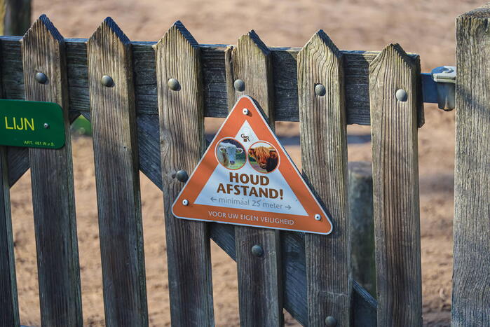 De boswachter gaat kijken of hij de koe kan vinden. Op veel plekken hangen waarschuwingsbordjes.