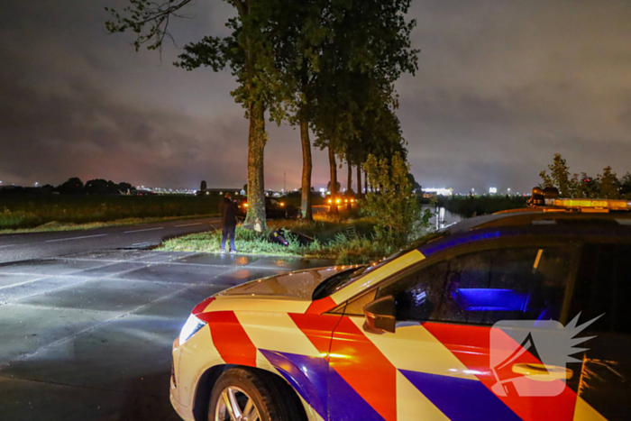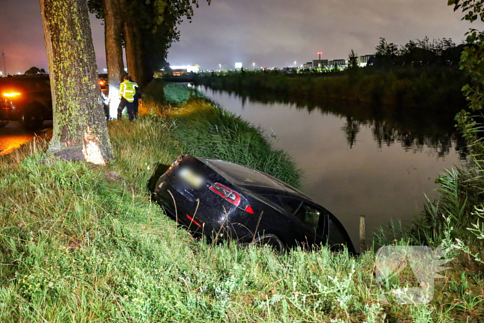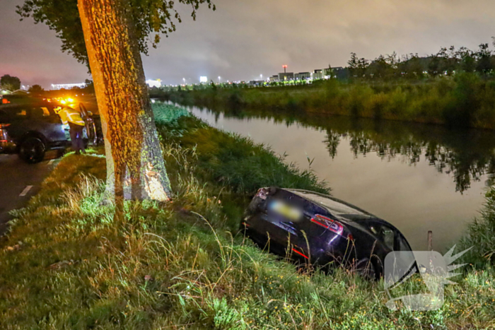 Een Tesla belandde in een sloot na een mogelijke aanrijding met een andere auto. Een inzittende van het voertuig werd in een ambulance gecontroleerd op mogelijke verwondingen. Een berger is onderweg om de Tesla uit de sloot te halen en af te voeren.