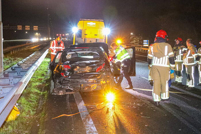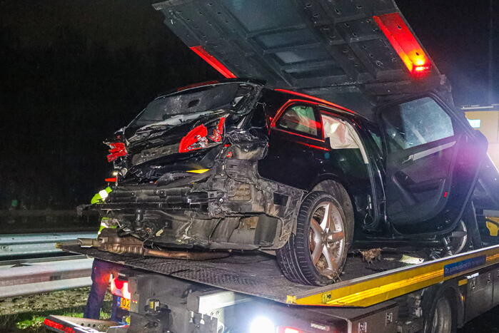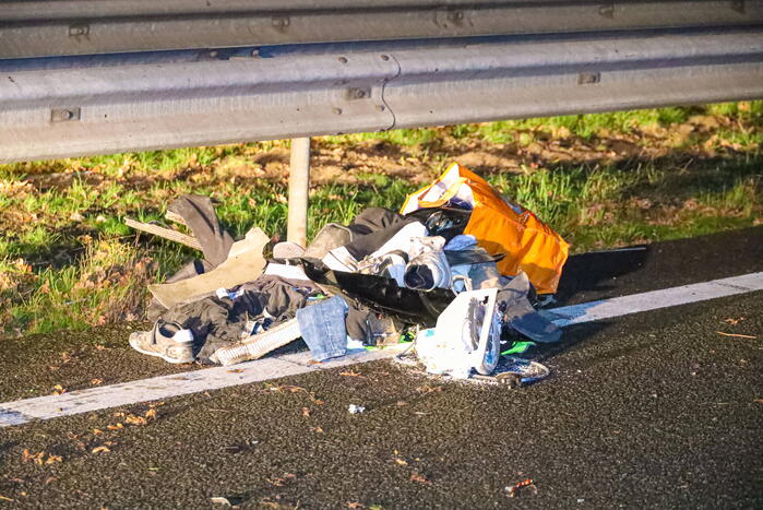 Er is veel schade ontstaan. De vangrail is stuk en de auto is total-loss. De spullen die op de rijbaan liggen, lagen voor het ongeluk nog in de kofferbak.