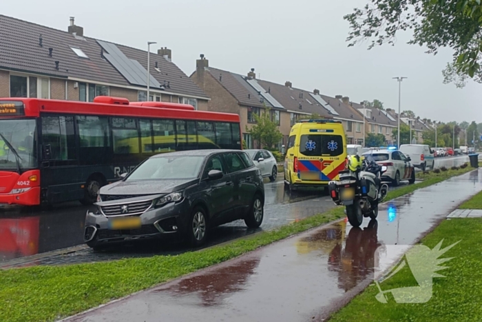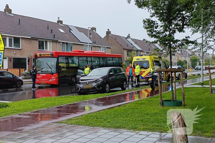 Een stadsbus en een personenauto waren met elkaar in botsing gekomen. De ambulancedienst heeft de inzittende nagekeken maar het is niet bekend of er iemand gewond is geraakt bij de aanrijding.