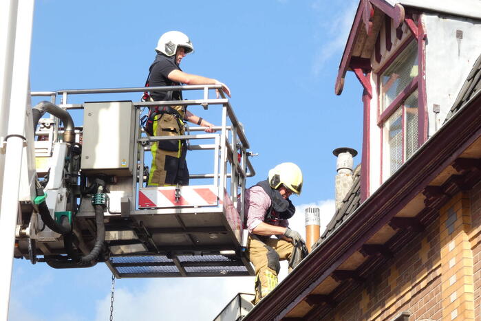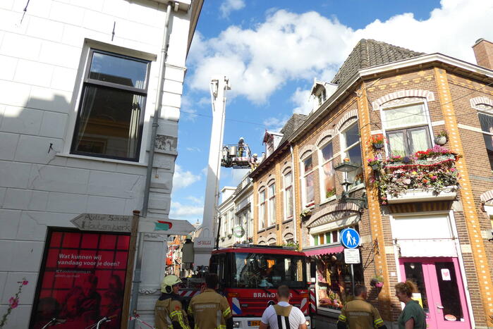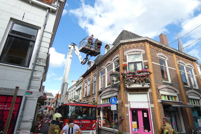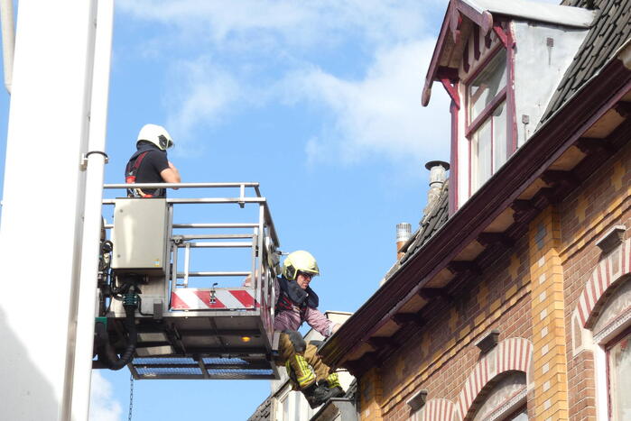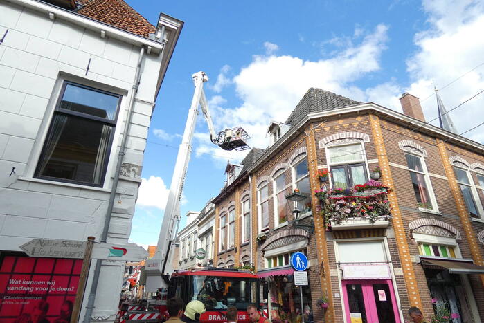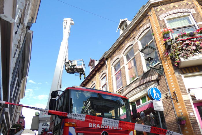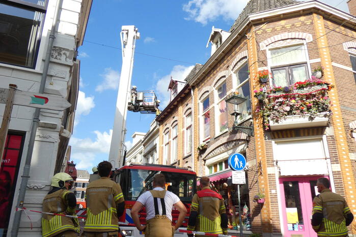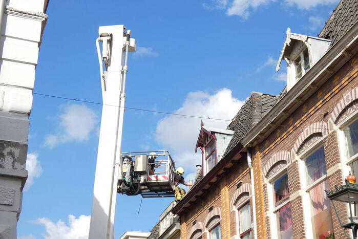 Meerdere dakpannen van een pand zijn los komen te liggen en dreigde van het dak op een terras te vallen. Met behulp van een hoogwerker heeft de brandweer de dakpannen weer vast gelegd waarna het gevaar geweken was. De straat was hierdoor kort afgesloten.