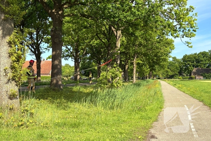 De brandweer ontving een oproep voor een gevaarlijk hangende tak. Met behulp van een lier heeft de brandweer de tak veilig naar beneden gehaald.