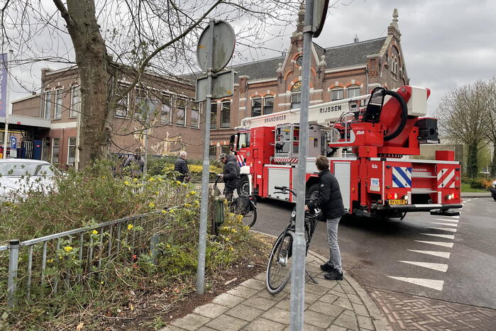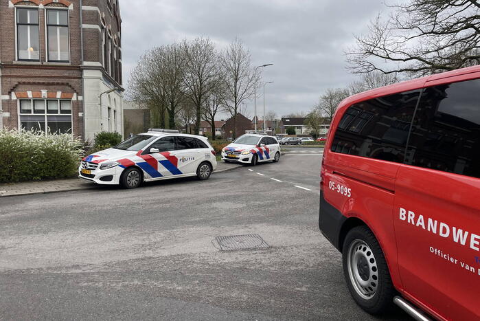 De brandweer is met meerdere voertuigen aanwezig om de brand te bestrijden.