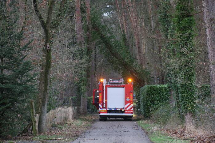 De boom hangt gevaarlijk boven het wegdek en balanceert op een boom aan de overkant van de weg. De brandweer is gekomen om een veilige situatie te creëren. Storm Dudley raast over het land en zorgt voor veel schades en gevaarlijke situaties.