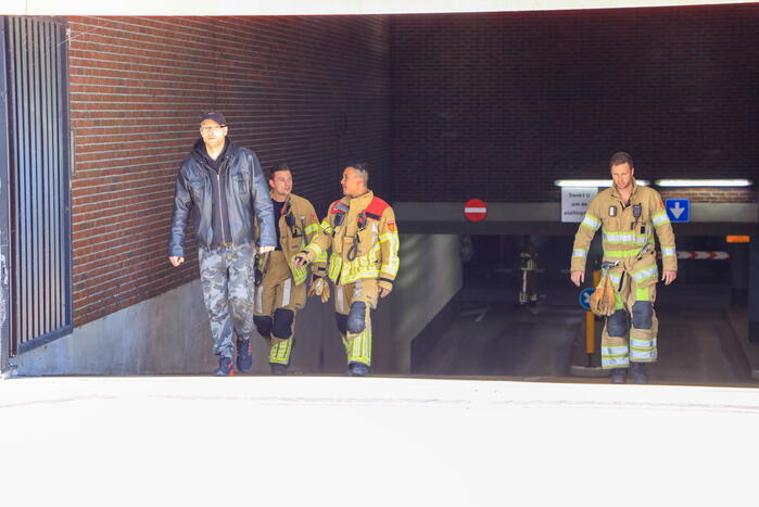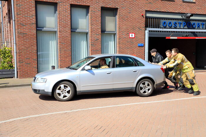Tijdens het starten van de auto ontstond door onbekende oorzaak kortsluiting. Uit werd de brandweer met spoed ingezet. Na een controle bleek er geen sprake te zijn van brand. Met hulp van een omstander is de auto uit de parkeergarage geduwd.