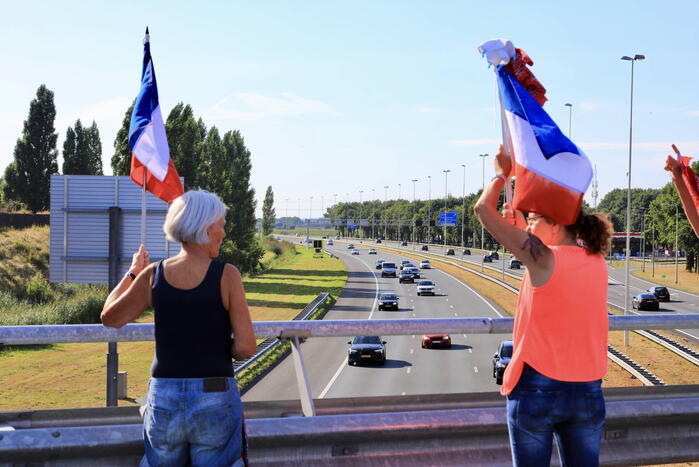 De groep burgers zwaaien met omgekeerde Nederlandse vlaggen naar het voorbijrijdende verkeer om één te zijn met de boeren.