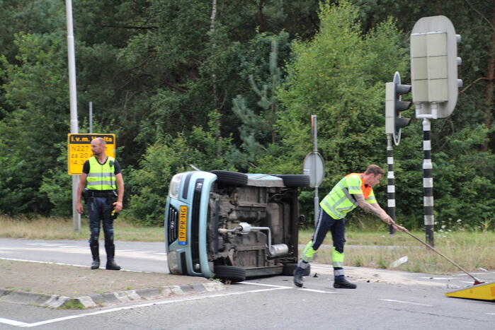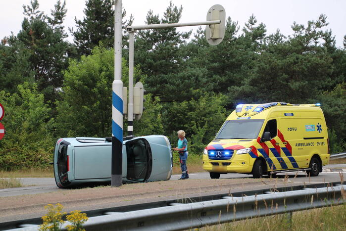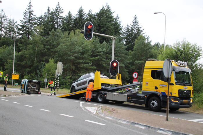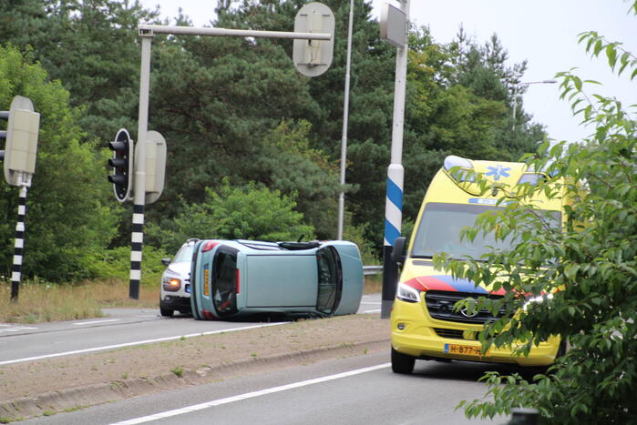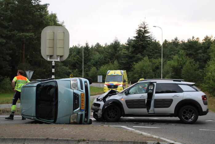 Bij een ongeval tussen twee personenauto's is één van de voertuigen op zijn kant terechtgekomen. De inzittenden zijn gecontroleerd door het ambulancepersoneel maar niemand raakte gewond. Beide voertuigen liepen zware schade op.