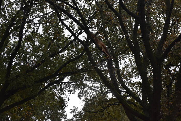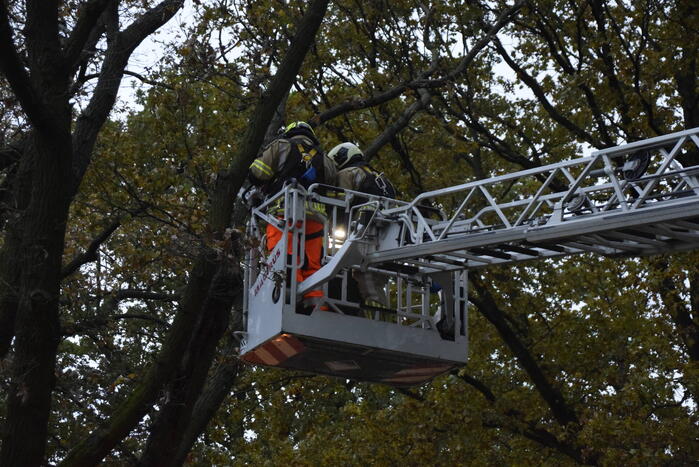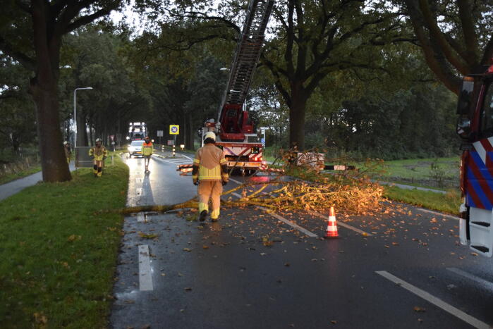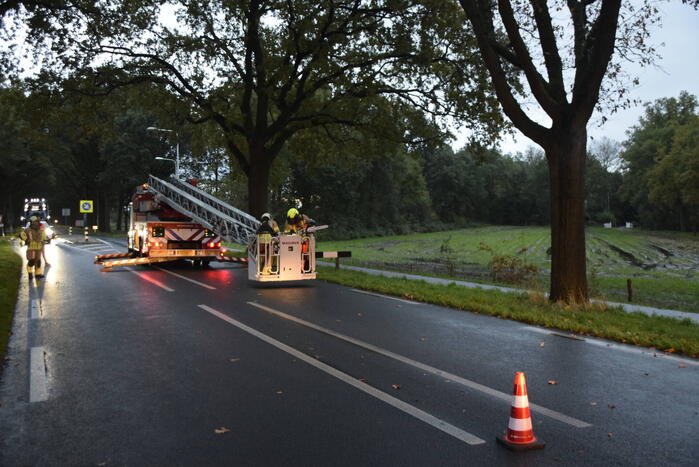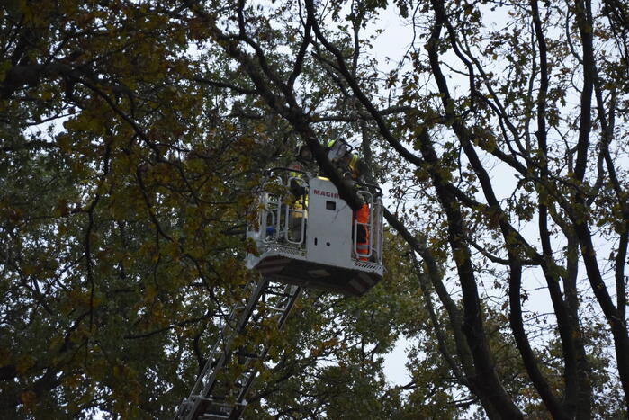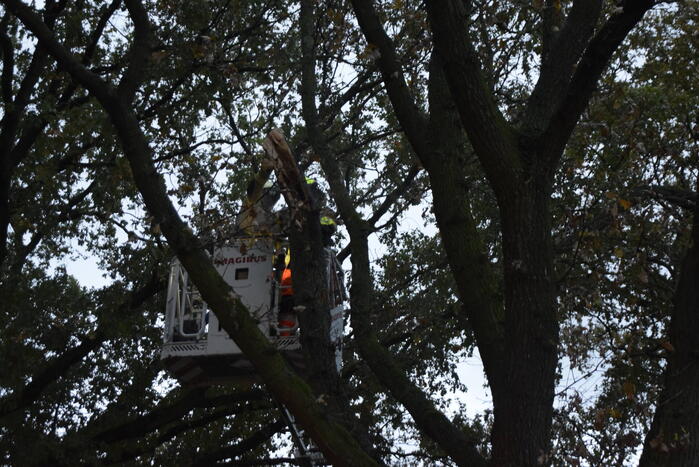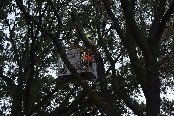 Door de weersomstandigheden dreigde een tak van een boom volledig af te breken en op de weg te vallen. Met behulp van een autoladder hebben brandweerlieden de tak verwijderd.