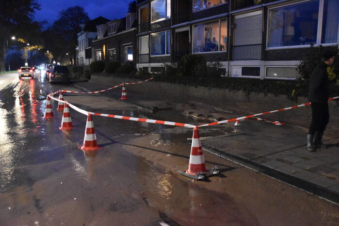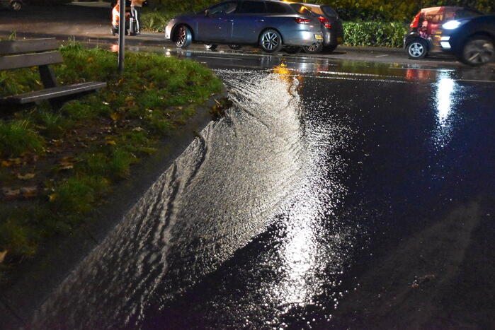 Door een breuk in een waterleiding is een flinke wateroverlast ontstaan. Een lager geleden parkeerterrein liep grotendeels onder water. Het nutsbedrijf is ter plekke voor de reparatie van de leiding. Door de breuk is een groot gat ontstaan in een stoep en veel zand over de weg gespoeld.