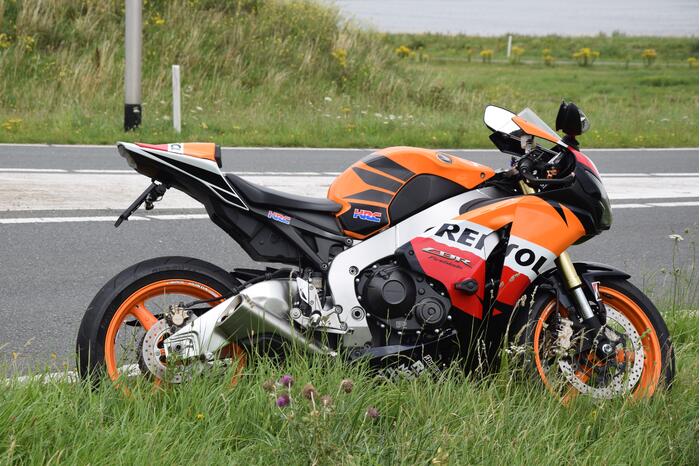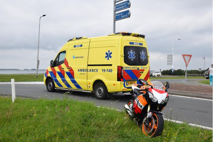 Een motorrijder is met zijn motor hard onderuit gegaan en gewond geraakt. nadat hij was gestabiliseerd is hij met een ambulance naar het ziekenhuis gebracht.