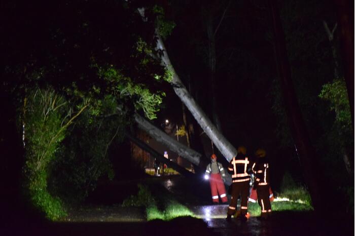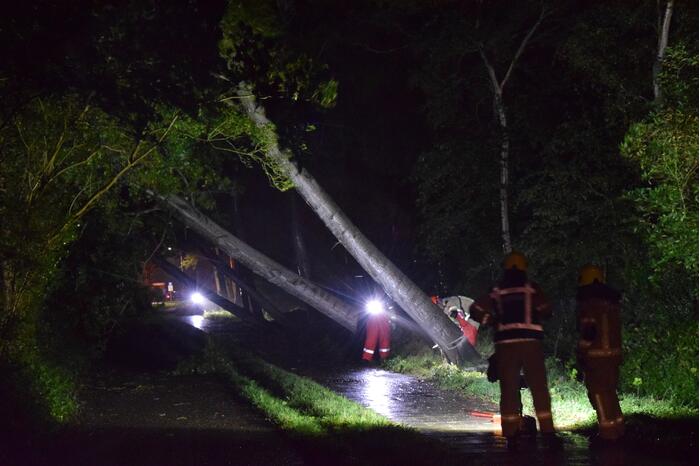 De brandweer zaagt de bomen in stukken en zal ze vervolgens aan de kant leggen. Zes bomen vielen tot nu toe om en meerdere bomen dreigen nog om te vallen.