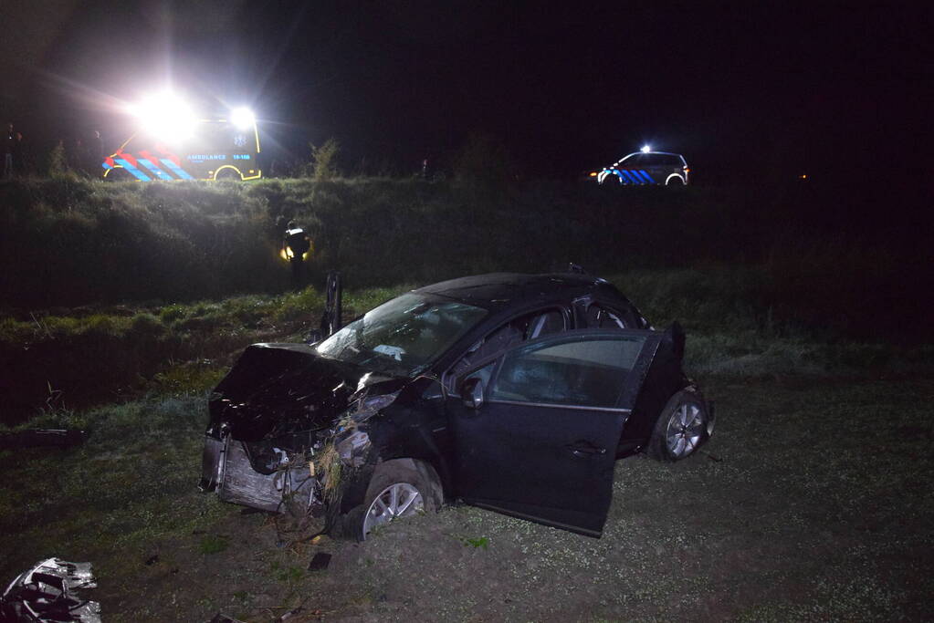 Auto belandt zwaar beschadigd in weiland bij eenzijdig ongeval