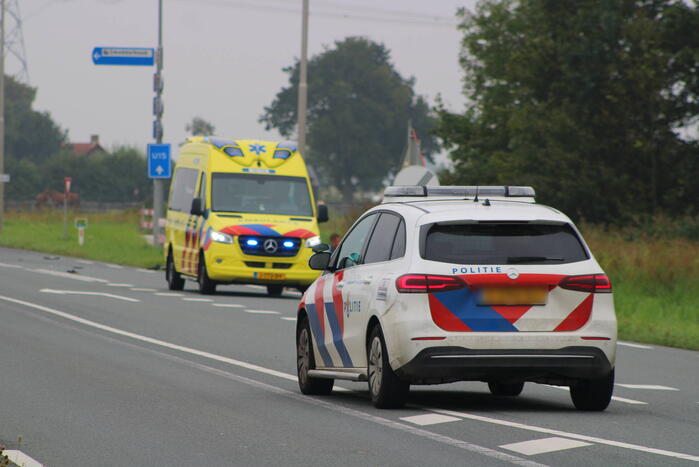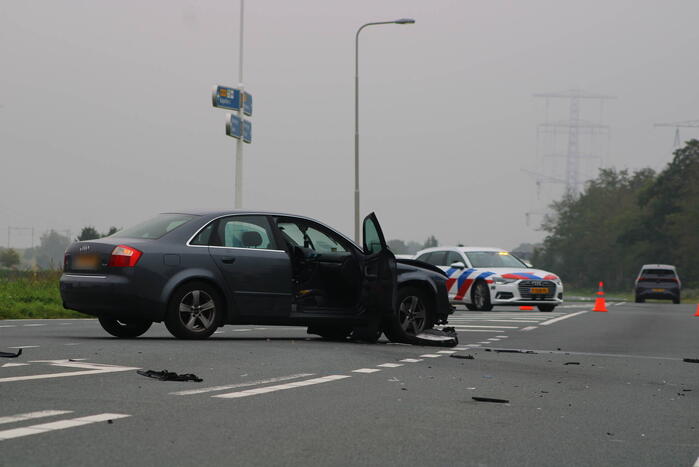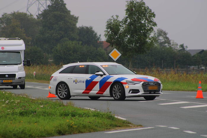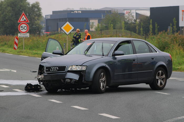 Op een kruising zijn een motorrijder en automobilist hard in botsing gekomen. De bestuurder van de motor raakte gewond en is behandeld in een ambulance. Het slachtoffer is ter controle vervoerd naar een ziekenhuis. Vier inzittenden uit de personenauto zijn na het ongeval op de vlucht geslagen. De politie is een zoekactie gestart naar vier personen en kon al snel twee van de vier verdachten aanhouden. De auto is in beslag genomen en wordt weggetakeld door een politieberger.