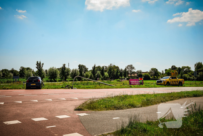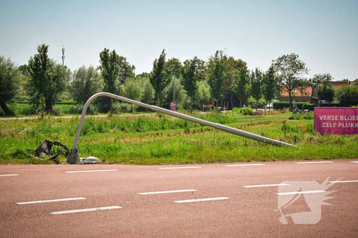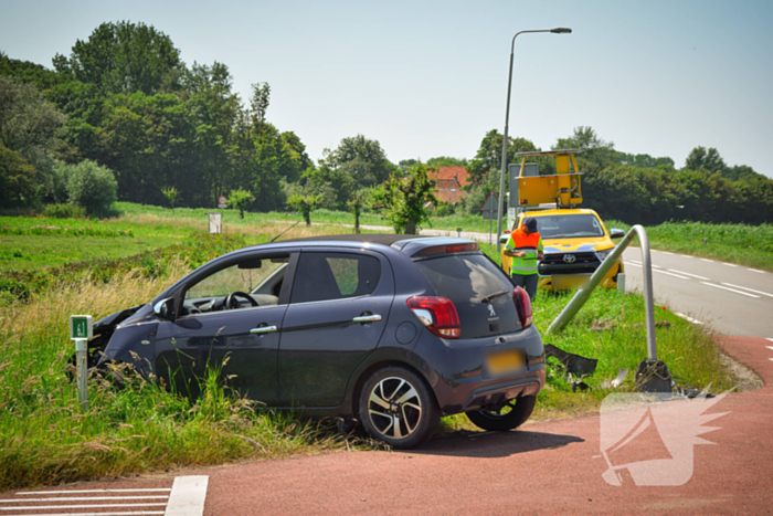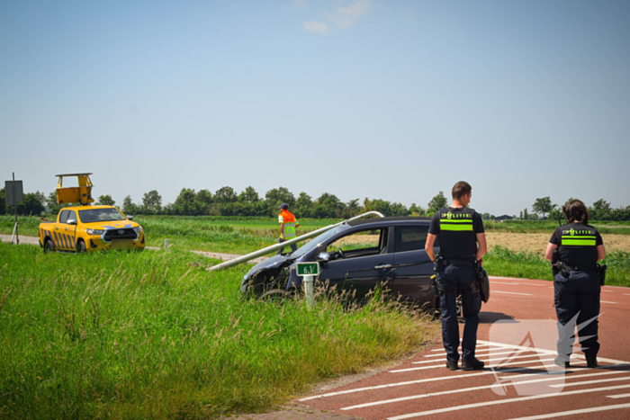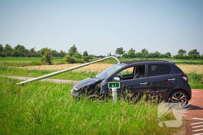 Een automobilist raakte vermoedelijk door de warmte van de weg en kwam tot stilstand tegen een lantaarnpaal. De auto en lantaarnpaaliepen fikse schade op.