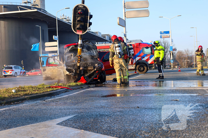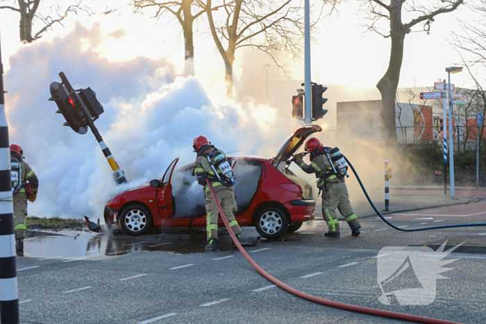 Een automobilist was door onbekende oorzaak tegen een verkeerslicht gebotst. Na de botsing vloog het voertuig in brand. Bij aankomst van de brandweer sloegen de vlammen al uit het voertuig. De inzittende(n) konden hun voertuig tijdig verlaten. Niemand raakte gewond.