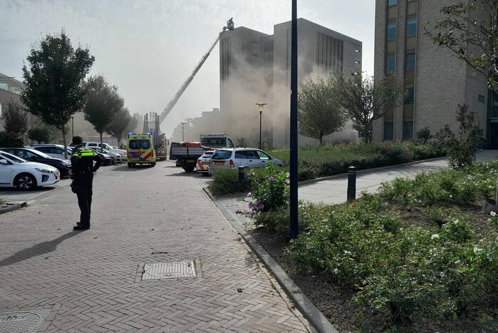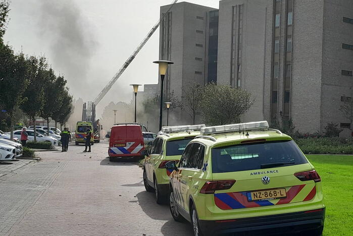 In een parkeergarage zijn twee auto's in brand geraakt. Vanwege de rookontwikkeling is de brandweer met meerdere blusvoertuigen aanwezig. De brand gaat geparkeerd met een flinke rookontwikkeling. Een persoon die in de parkeergarage was, is zwaargewond naar het ziekenhuis overgebracht.
