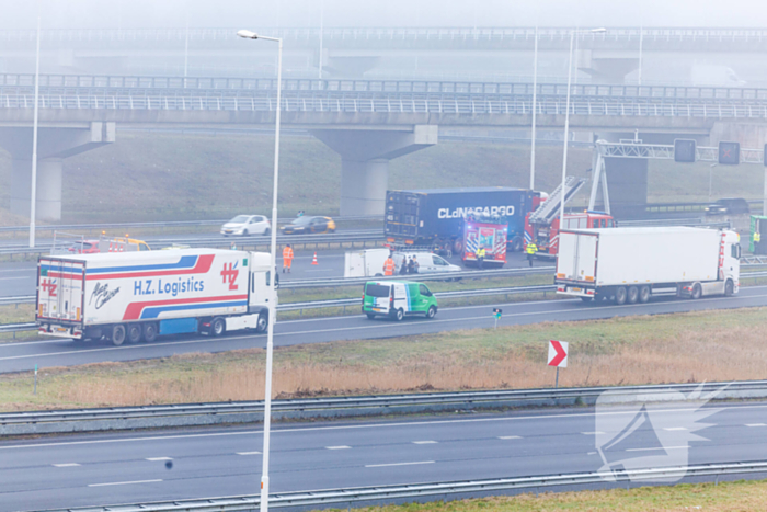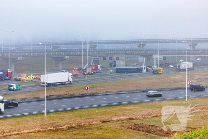 Op de snelweg is een vrachtwagen met oplegger gekanteld. Er zou ook een bestelbus met aanhanger bij betrokken zijn. Meerdere hulpdiensten zijn ingezet. Zover bekend is niemand gewond geraakt. Door het ongeval is deel van de snelweg afgesloten, dit zorgt voor de nodige verkeershinder.