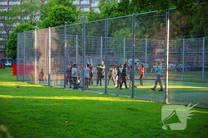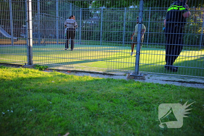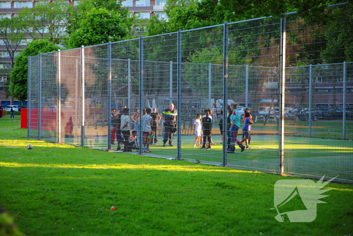 Een kind raakte gewond tijdens het spelen op een voetbalveldje. Tijdens een sliding in een voetbalkooi kwam het kind met zijn been vast te zitten in het hek. De brandweer werd ingeschakeld om het hek open te knippen. Een ambulance arriveerde ter plekke en heeft het kind naar het ziekenhuis vervoerd voor verdere behandeling.