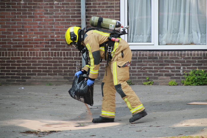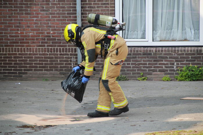 De brandweer heeft het riool gespoeld en op de stoep absorberende korrels gegooid zodat de vloeistof sneller opdroogt.