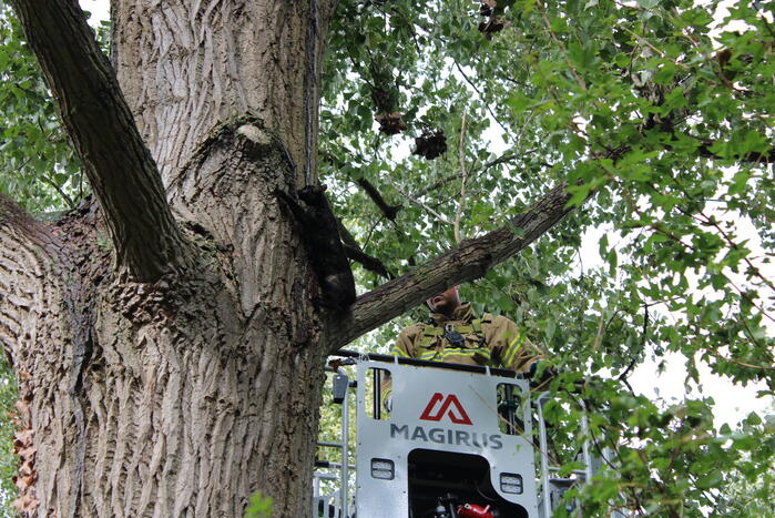 De brandweer zette een autoladder in om bij een kat te komen die in een boom zat. Met moeite heeft een brandweerman het dier uit de boom gehaald waarna deze aan de eigenaar overgedragen kon worden.
