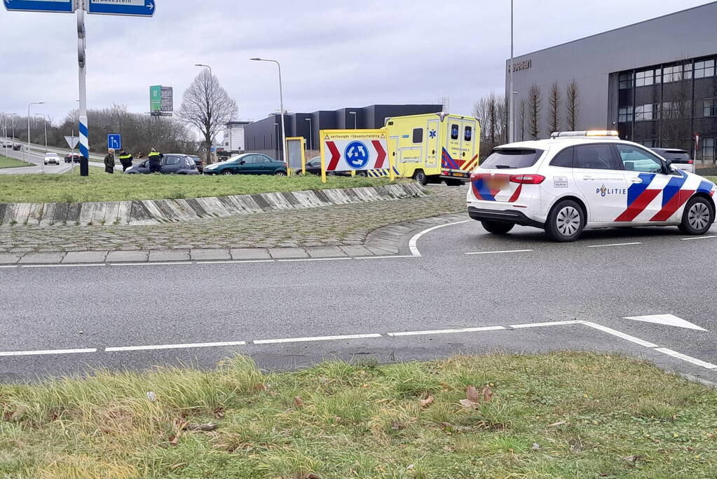Twee personenwagens botsen op rotonde