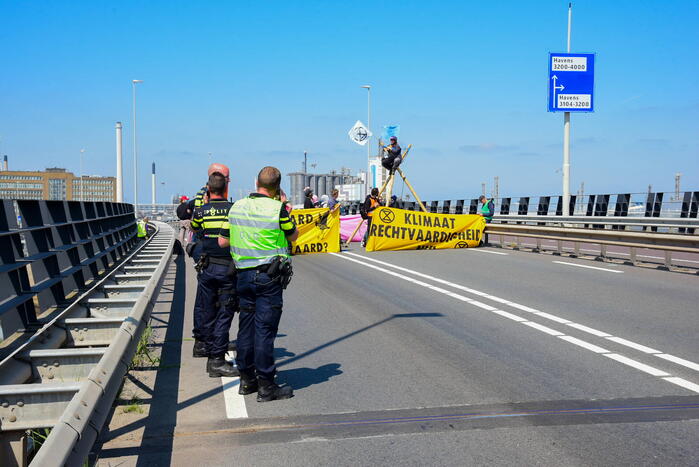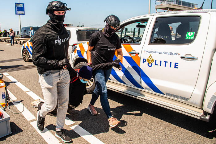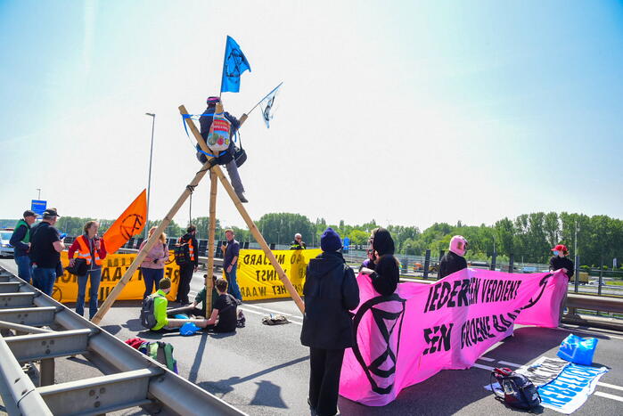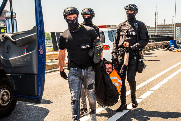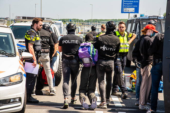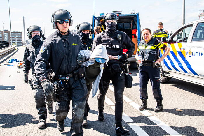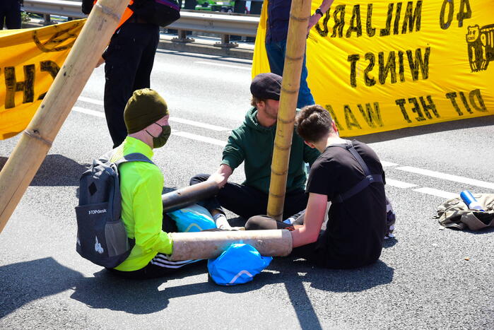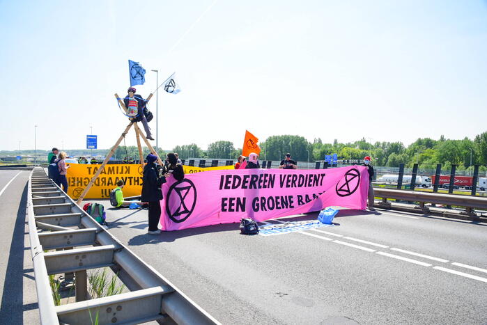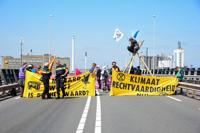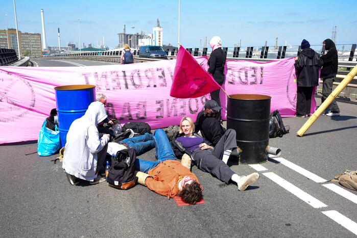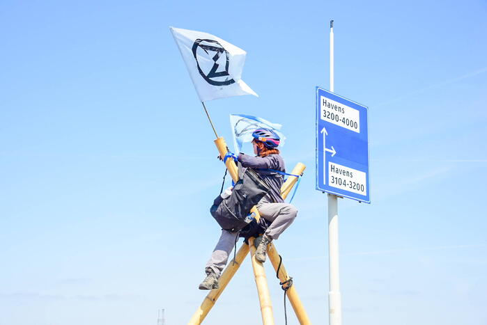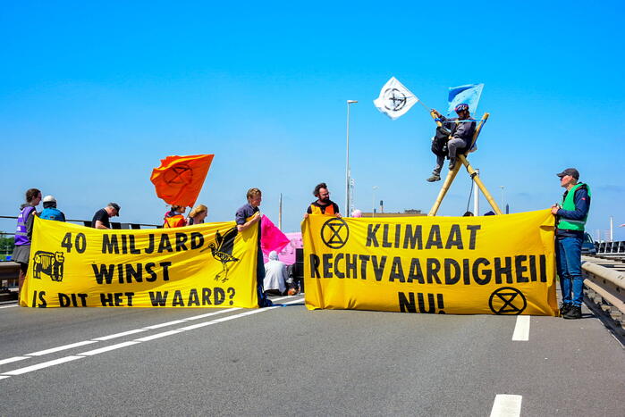 Demonstranten van Extinction Rebellion hebben de toegangsweg naar de Shell geblokkerd. De politie is aanwezig om alles goed te laten verlopen en maken een plan van aanpak om de weg zo snel mogelijk vrij te maken.