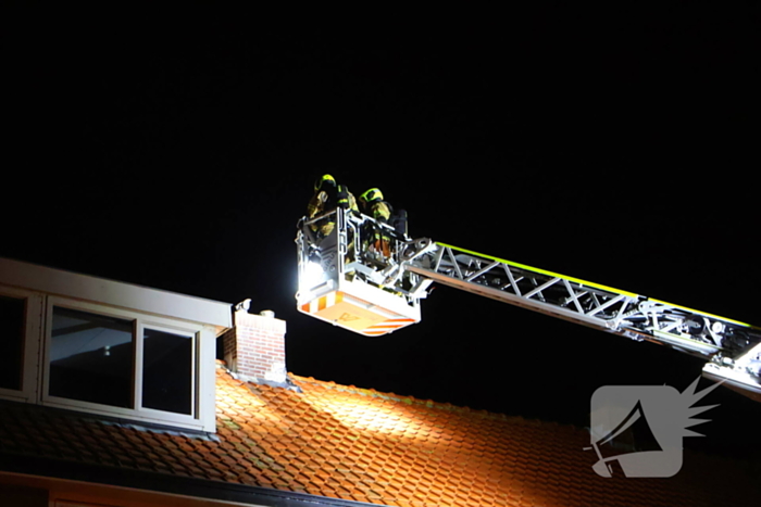 De brandweer heeft de brand opgeschaald naar het sein 'middelbrand' en is met een autoladder bij de schoorsteen bezig. De brand werd opgeschaald omdat de hitte en rook een naastgelegen woning in trok. De schoorsteen werd geveegd met behulp van een ramoneur.