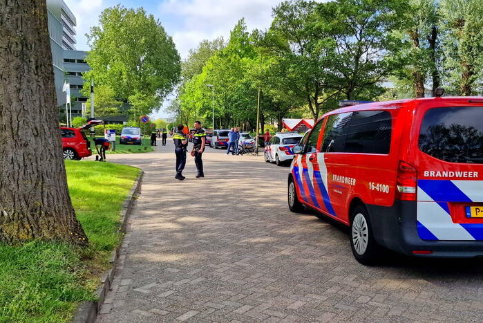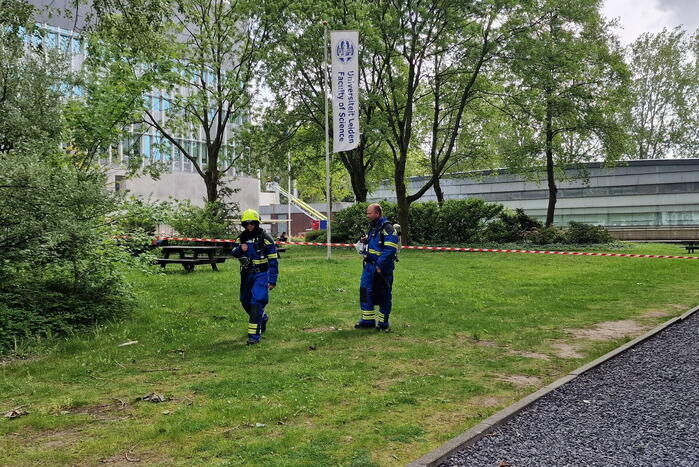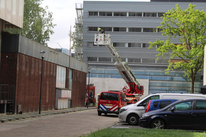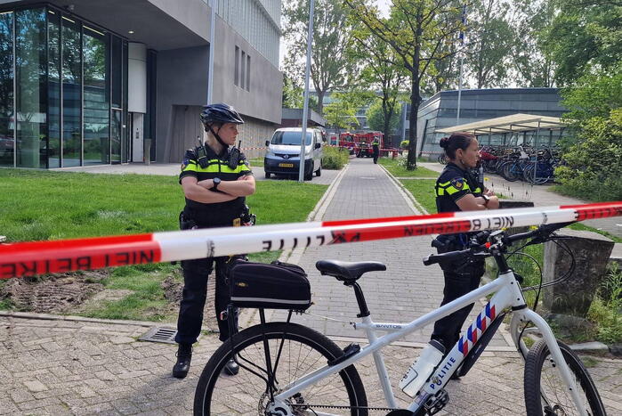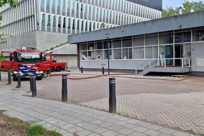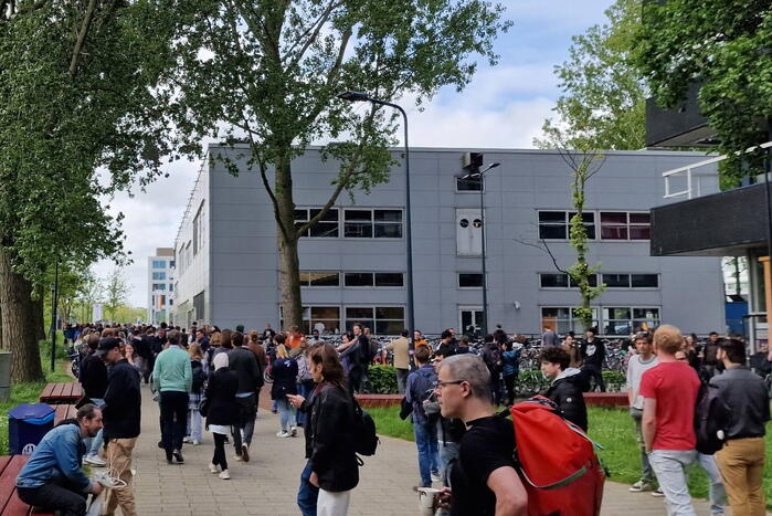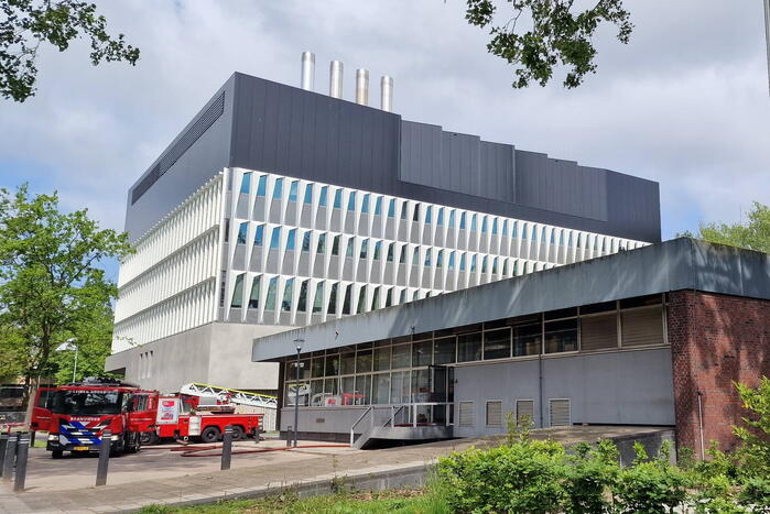 Door de brand wordt een deel van de Universiteit ontruimd. Monteurs van Liander zijn bezig met herstelwerkzaamheden zodat iedereen weer stroom heeft.