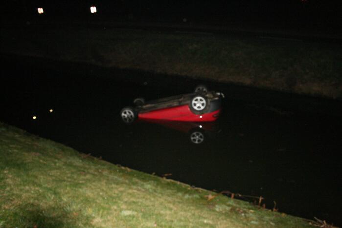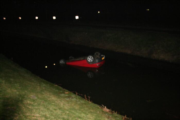 Een auto is op zijn kop te water geraakt. De bestuurder is met de schrik vrijgekomen. Het onduidelijk hoe het ongeval heeft kunnen gebeuren.