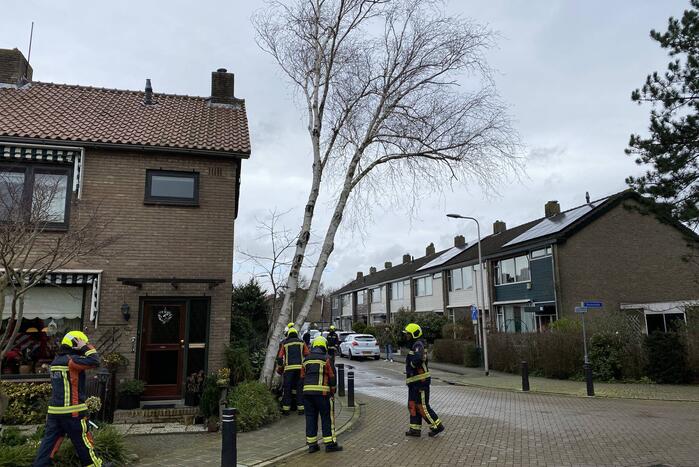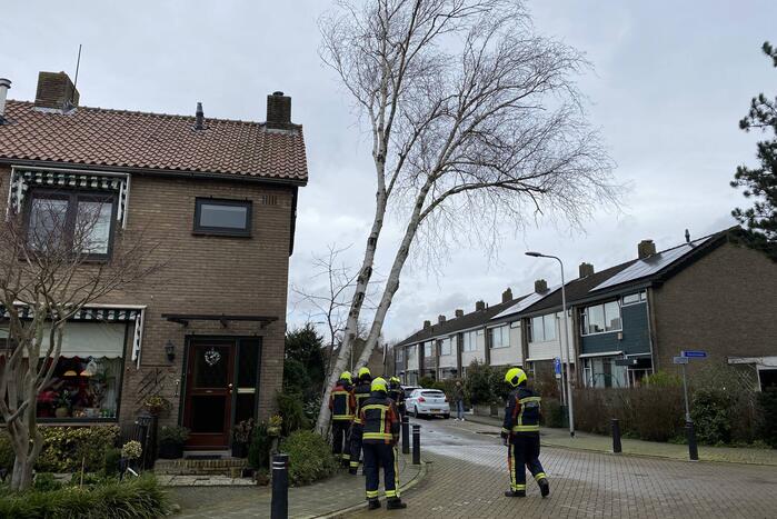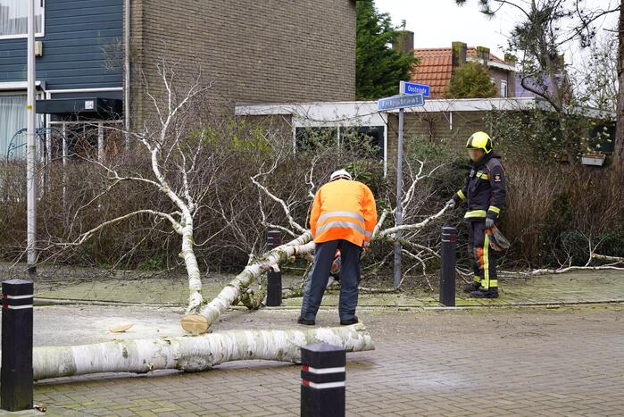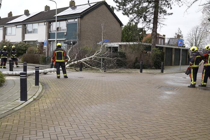 De boomstammen hingen over de weg. De brandweer kwam ter plekke en zaagde de stammen om zodat deze naar beneden kwamen. Hierna zijn ze klein gezaagd.