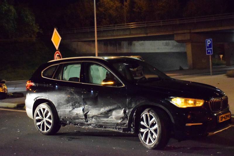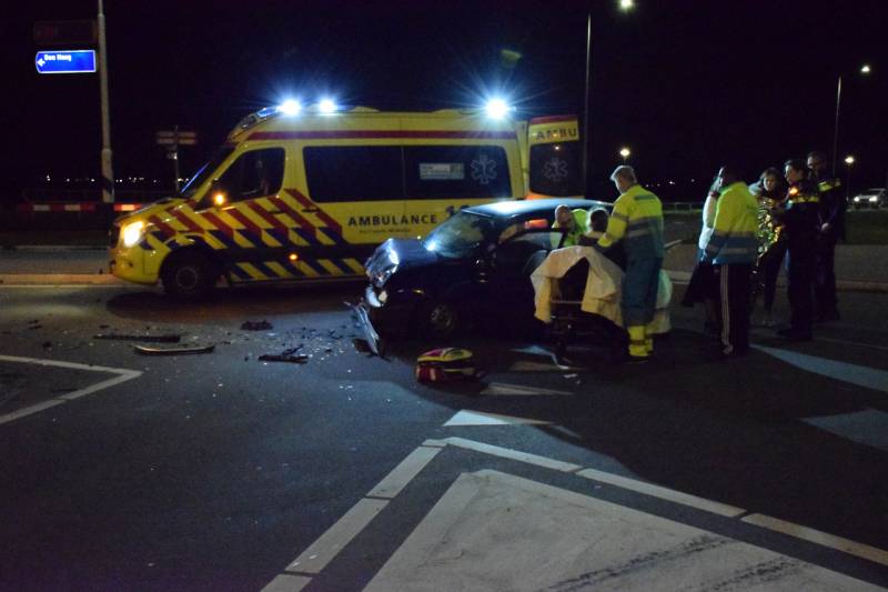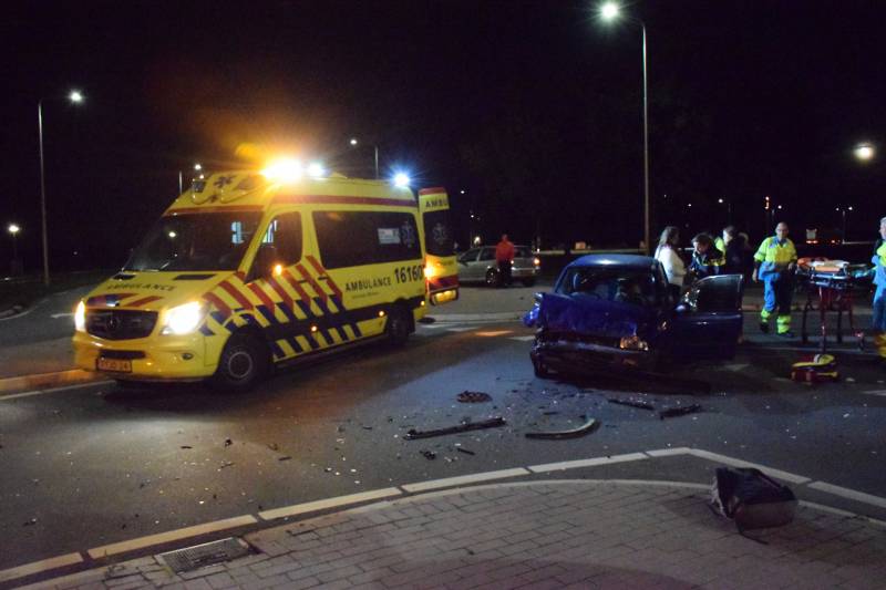 Twee personenautos zijn door onbekende reden hard op elkaar gebotst. Een bestuurder raakte hierbij gewond, deze word in een ambulance vervoerd naar het ziekenhuis.