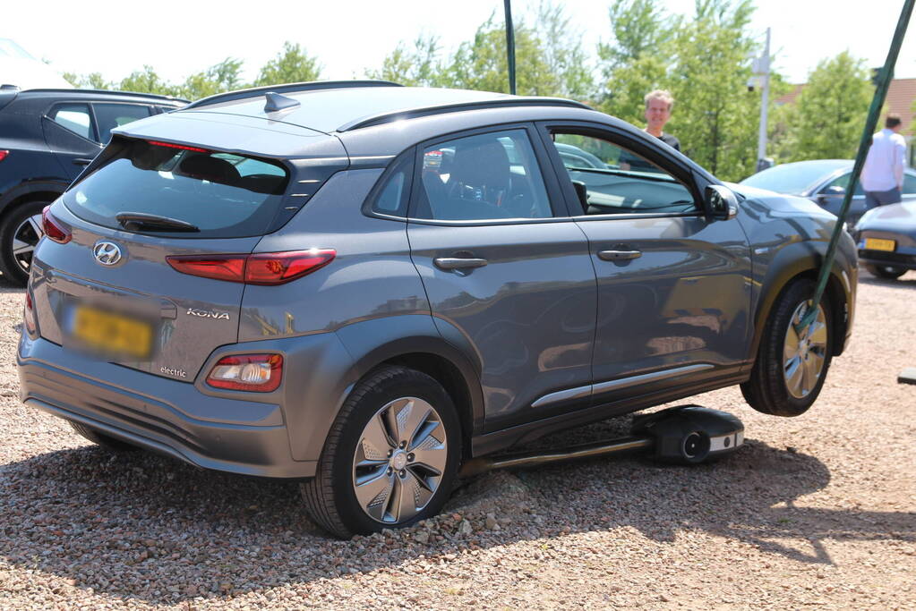 Elektrische personenauto rijdt oplaadpaal uit de grond
