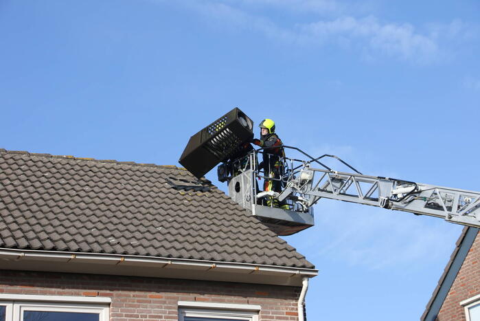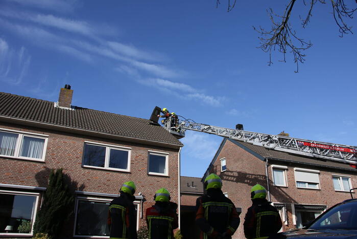De brandweer heeft met behulp van een ladderwagen de schoorsteen veilig weten te verwijderen. Niemand raakte gewond.