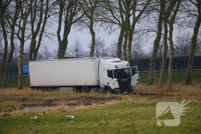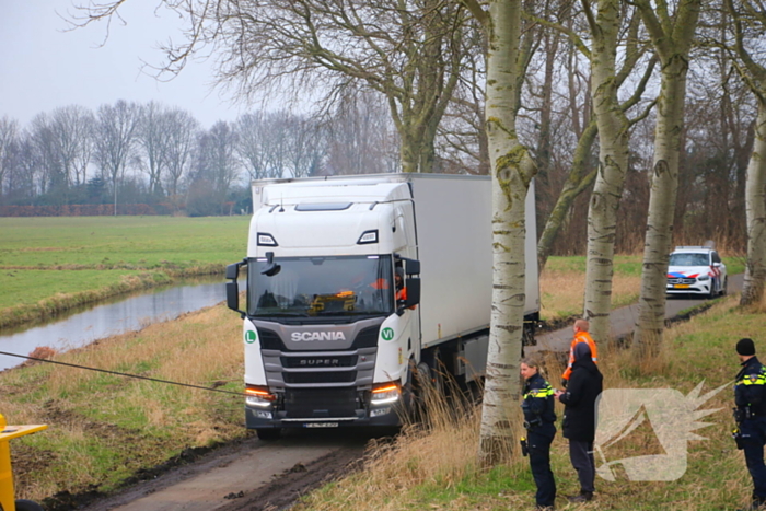 RIJNSBURG - Maandag 10 februari is een vrachtwagen vast komen te zitten in de berm van een fietspad aan het Kanaalpad Noord-Oost in 112 Rijnsburg.