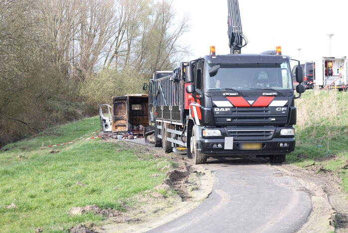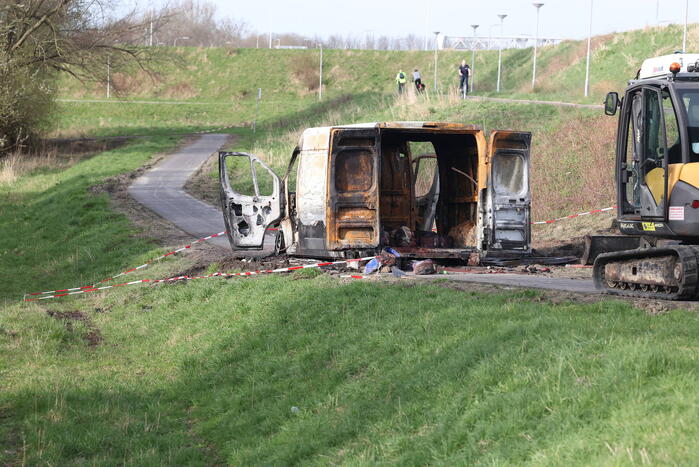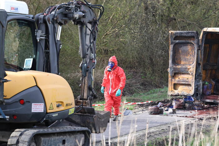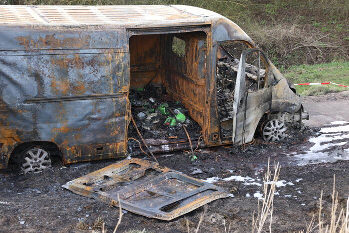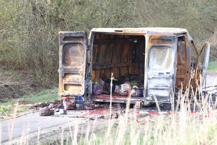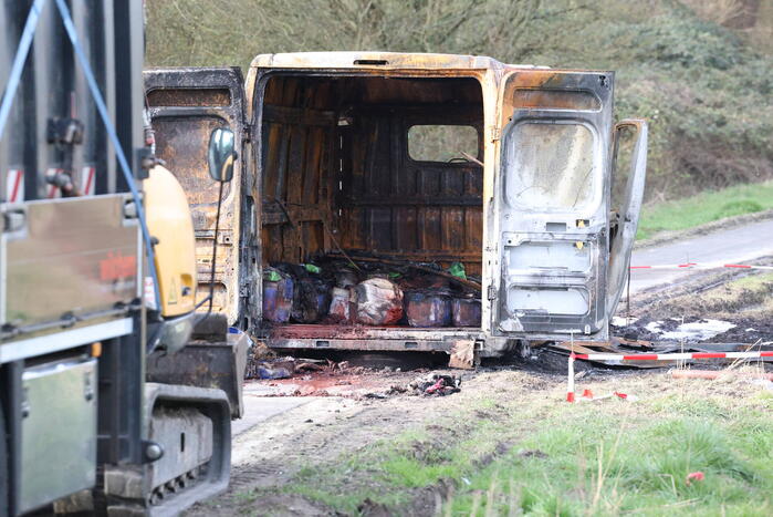 Afgelopen nacht brandde de bestelbus volledig uit. Uiteindelijk bleek de laadruimte van de bestelbus vol met chemische vasten te zitten. Een gespecialiseerd bedrijf is bezig met het opruimen van de rommel.