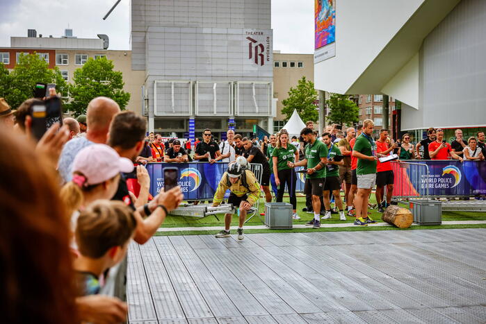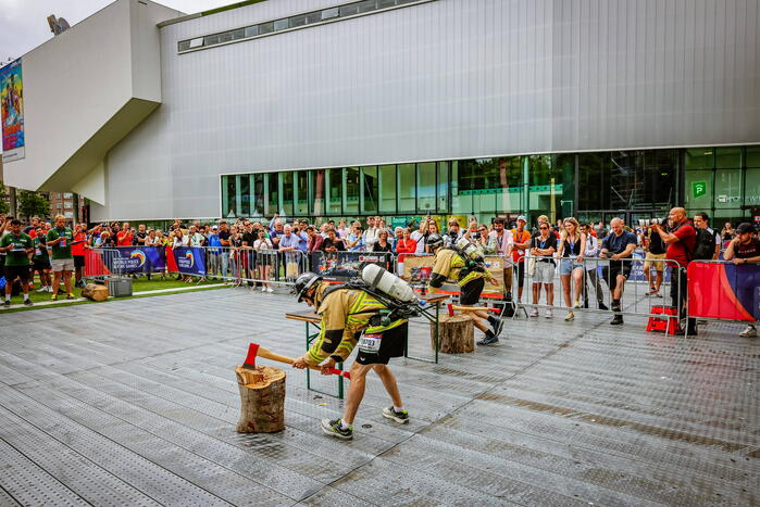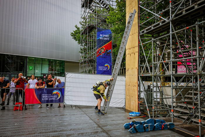 ROTTERDAM - Maandag 25 juli trok de World Police Fire Games veel bekijks. Aan de Schouwburgplein in 112 Rotterdam vond het onderdeel 'Ultimate Fire Fighter plaats.