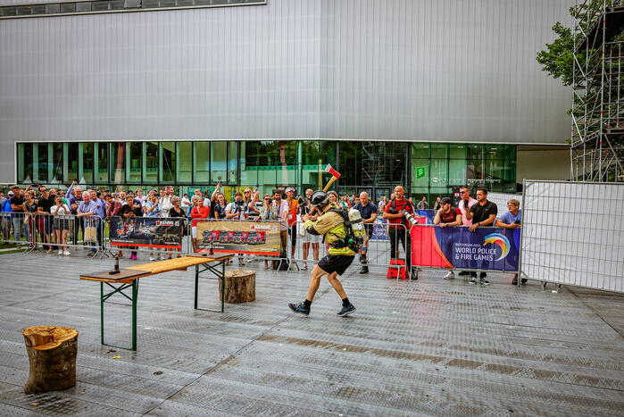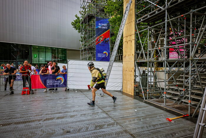 Het brandweer-onderdeel trok enorm veel bekijks van belangstellenden. Deze week vindt het World Police Fire Games plaats. Ruim 10.000 van over de hele wereld die werkzaam zijn bij politie, brandweer, douane en DJI sporten tegen elkaar.