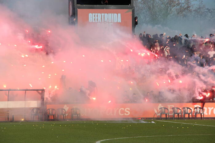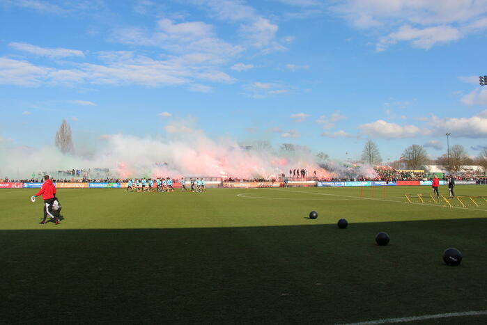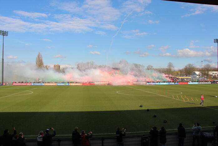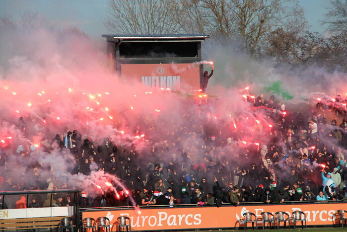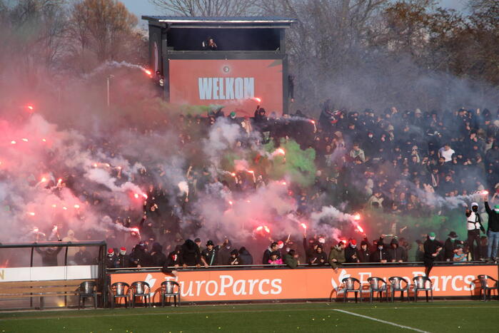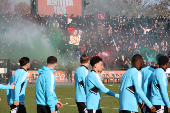 Bij de training waren veel supporters met vuurwerk aanwezig om de ploeg aan te moedigen richting de wedstrijd tegen Ajax van zondagmiddag.