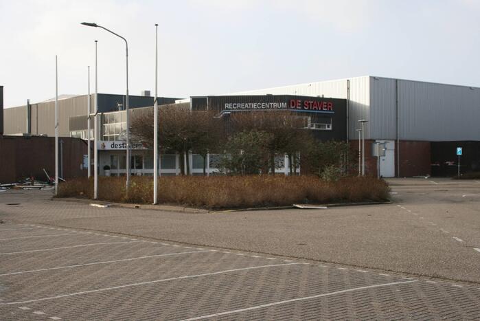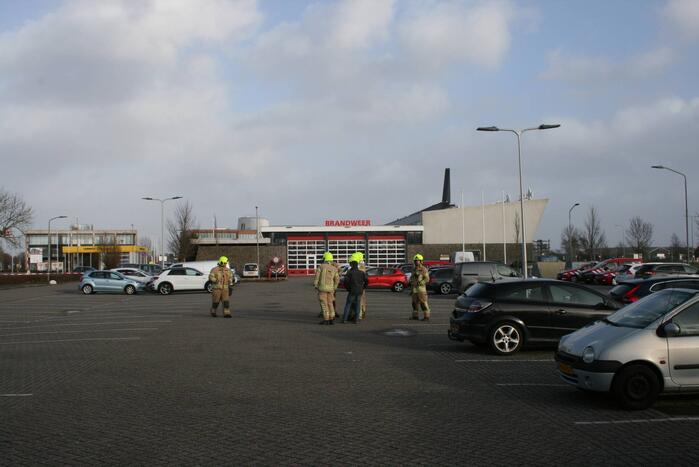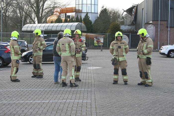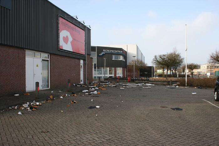 De brandweer kwam ter plaatse om de situatie veilig te stellen. Delen van het dak lagen over de hele parkeerplaats verspreid.