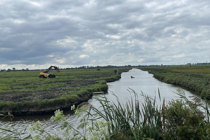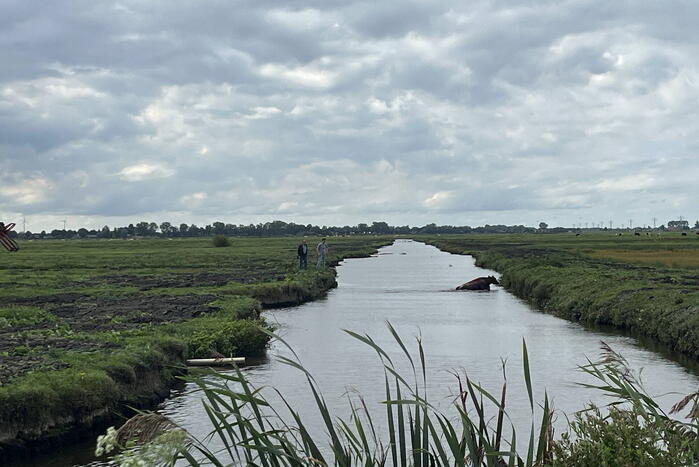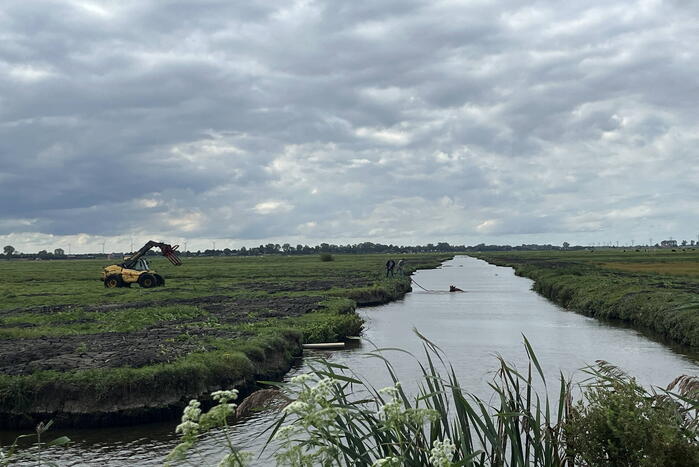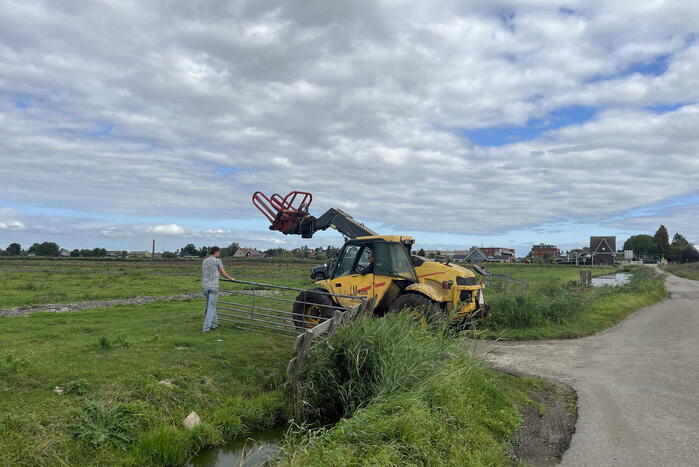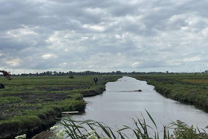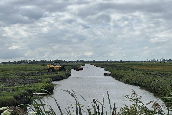 Een koe zit vast in een sloot en kan er niet meer zelfstandig uitkomen. De boer heeft met gebruik van een shovel de koe uit de sloot kunnen halen.