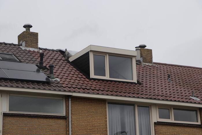 Bij een dakkapel was door de harde wind de dakbedekking los gewaaid en omgeklapt. De brandweer gaat op een later moment met een ladderwagen naar boven om de schade te verhelpen.