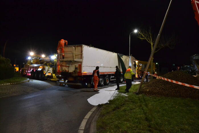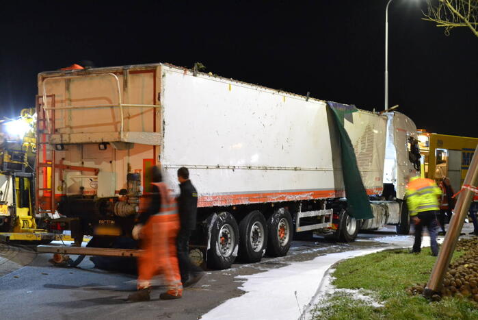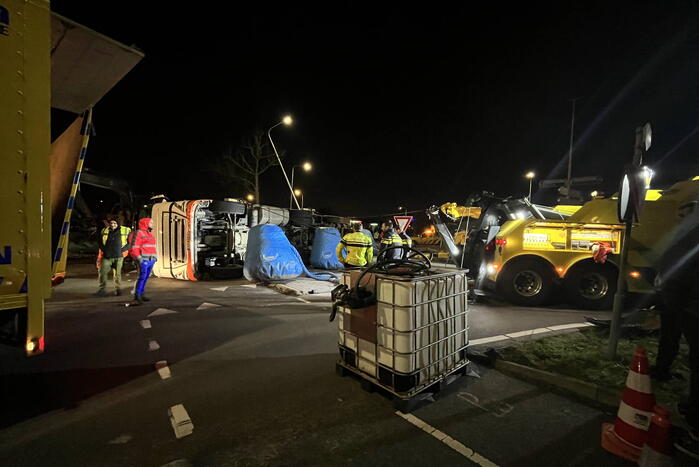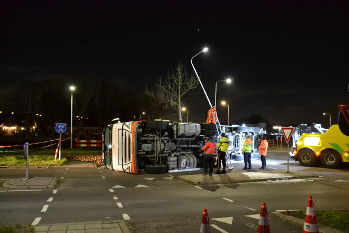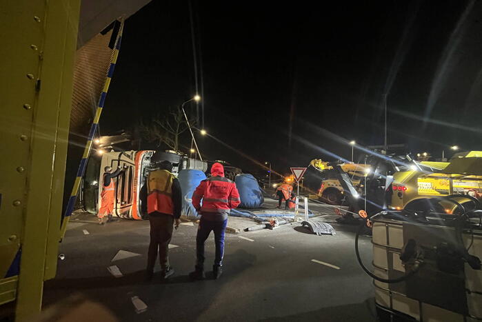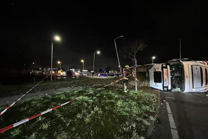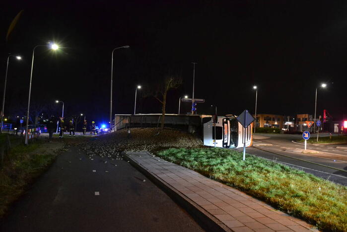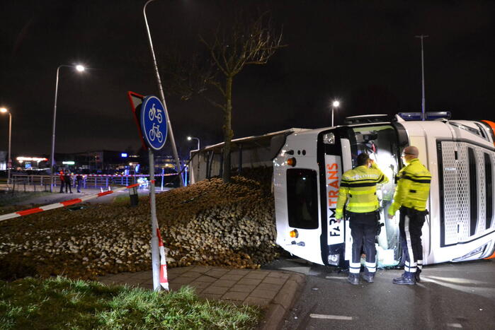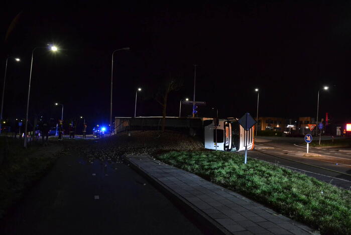 Een vrachtwagen, volgeladen met aardappelen, was op de rotronde gekanteld. Daarbij raakte hij lantaarnpaal en verloor de vrachtwagen grotendeels de lading. Het ambulancepersoneel heeft de vrachtwagenchauffeur nagekeken in de ambulance maar deze hoefde niet naar het ziekenhuis te worden vervoerd. Brandweerlieden verlenen hand- en spandiensten.
