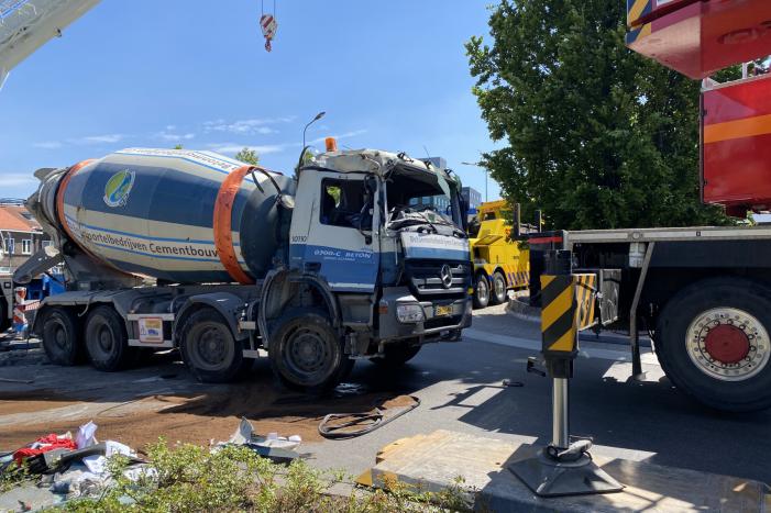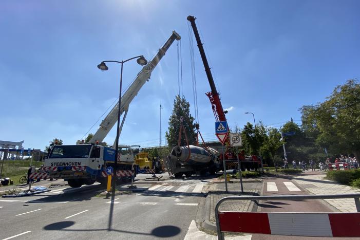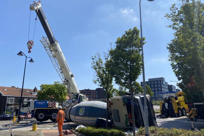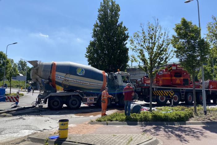 Een cementwagen is op een rotonde door onbekende oorzaak omgevallen. De bestuurder is gewond geraakt en met een ambulance naar het ziekenhuis vervoerd.